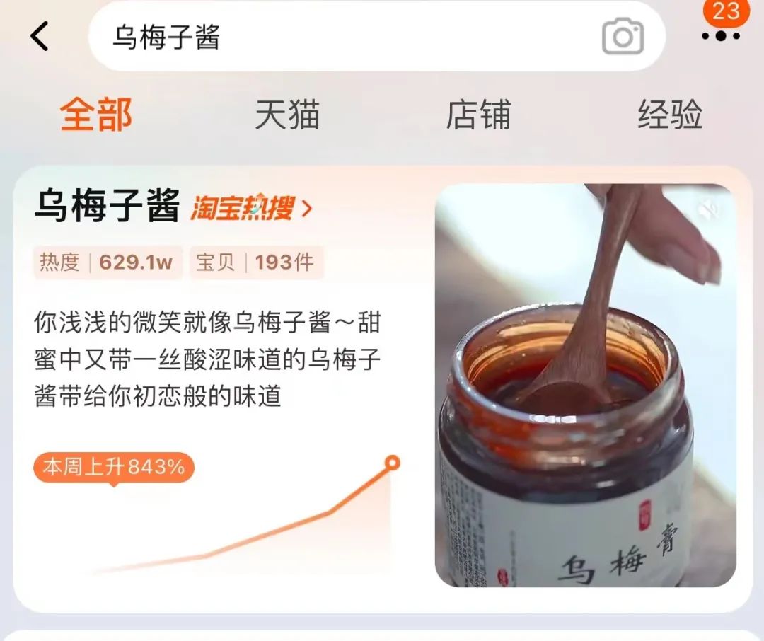 数据显示,在淘宝平台“乌梅子酱”搜索的热度一周内上升了843%,达到629.1万,小红书上关于乌梅子酱笔记的数量超过5万+,相关商品达2万+件。