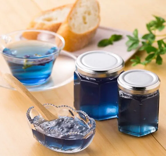 虽然用蓝莓或黑莓制成的果酱略带深蓝色并不罕见,但这款由JT &Associates生产并通过 Village Vanguard 销售的蓝色果酱却拥有完全不同的蓝色色调。赋予Village Vanguard果酱独特色彩的是一种名为Anchan(牛蒡根)或“蝴蝶豌豆”的泰国草本植物,该植物通常呈现出亮蓝色。该产品带有苹果风味,可用于增加早餐和小吃的风味。