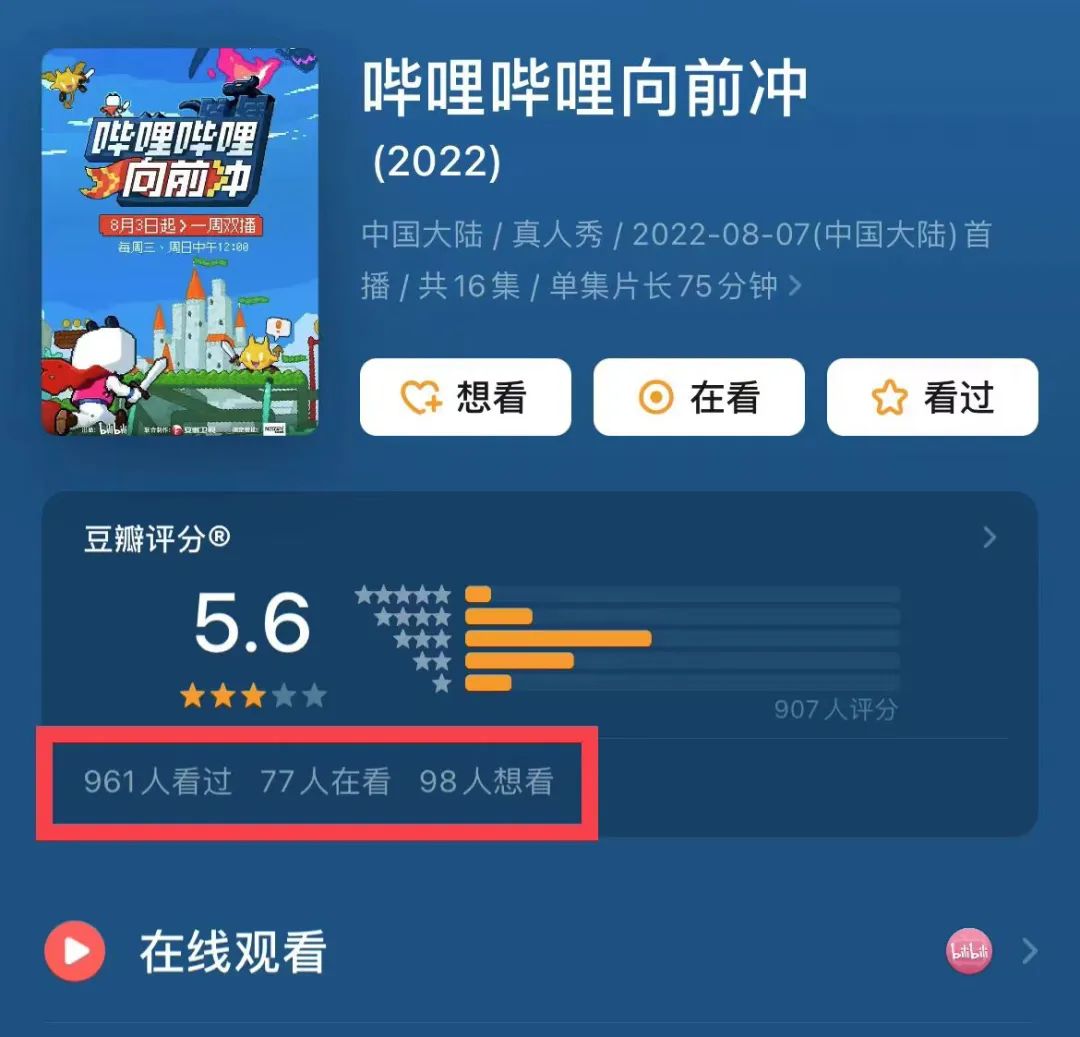 但与老少皆宜的《男生女生向前冲》相比,《哔哩哔哩向前冲》把参赛选手固定在了B站UP主中。UP主闯关的趣味性远低于素人,导致了除非是UP主的粉丝否则观众很难在节目中找到乐趣,无形中提高了综艺的收看门槛。于是出现了这样的怪象,同样的赛制同样的综艺形式,《男生女生向前冲》引领了2022年春天全民运动的风潮,《哔哩哔哩向前冲》在豆瓣仅有961人看过。