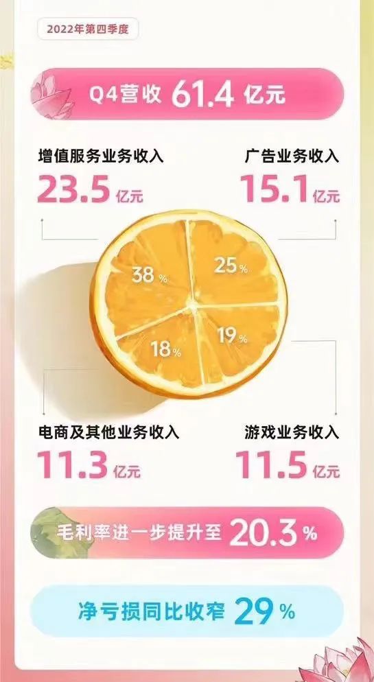 虽然B站财报显示在2022年第四季度营收61.4亿元,净亏损达到15亿元,但较2021年同期相比,已经减亏了约29%。所以B站对已经到来的2023,做出了全年收入预计240亿元至260亿元的美好展望。