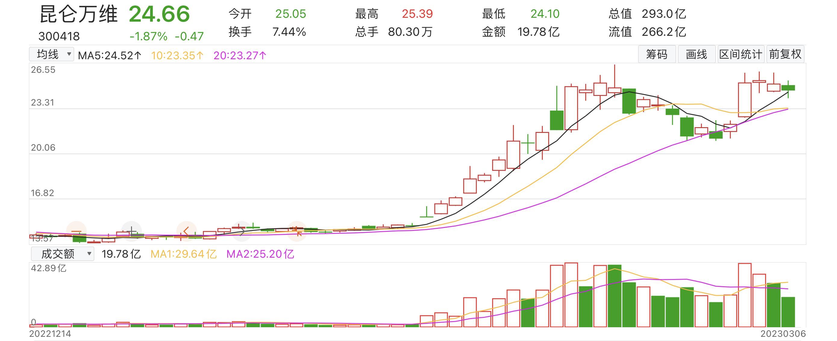 消息一出,让昆仑万维股价连续几日持续走高,一度跃至最高点26.55元/股。相较于年初,昆仓万维总市值增加超百亿。截至3月6日收盘,昆仑万维股价为24.66元/股。