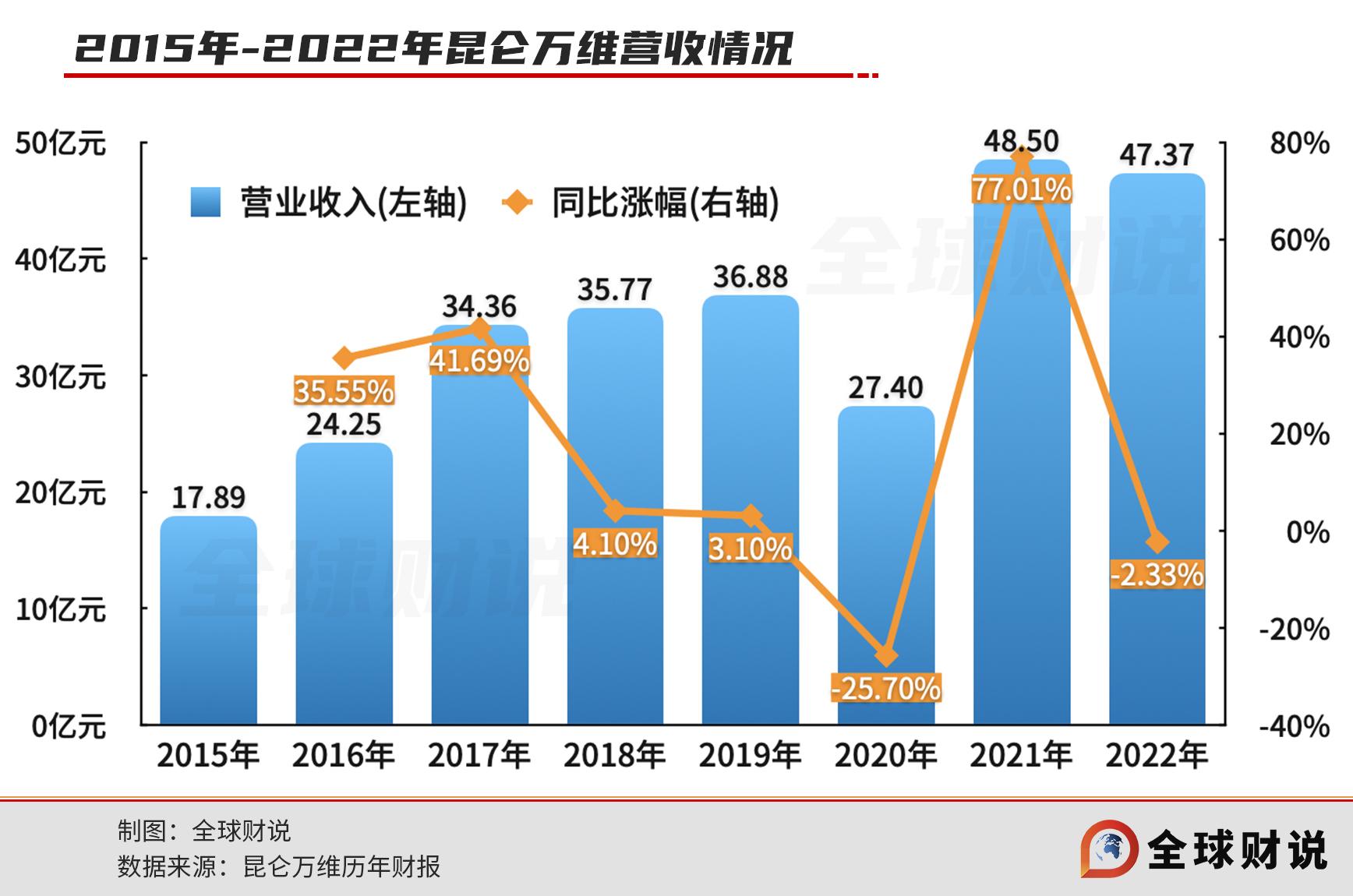根据近几年昆仑万维的发展情况来看,大量的投资,确实让昆仑万维在短短几年时间实现了规模翻倍,营业收入由2015年的17.89亿元增长至2021年的48.5亿元。