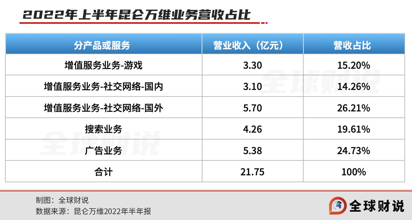 对于如今的昆仑万维来说,游戏业务仅是其中一个不太起眼的业务板块。遥看2015年初登创业板时,昆仑万维游戏收入的营收占比高达97.52%,可到了2022年上半年该数据已降至15%。