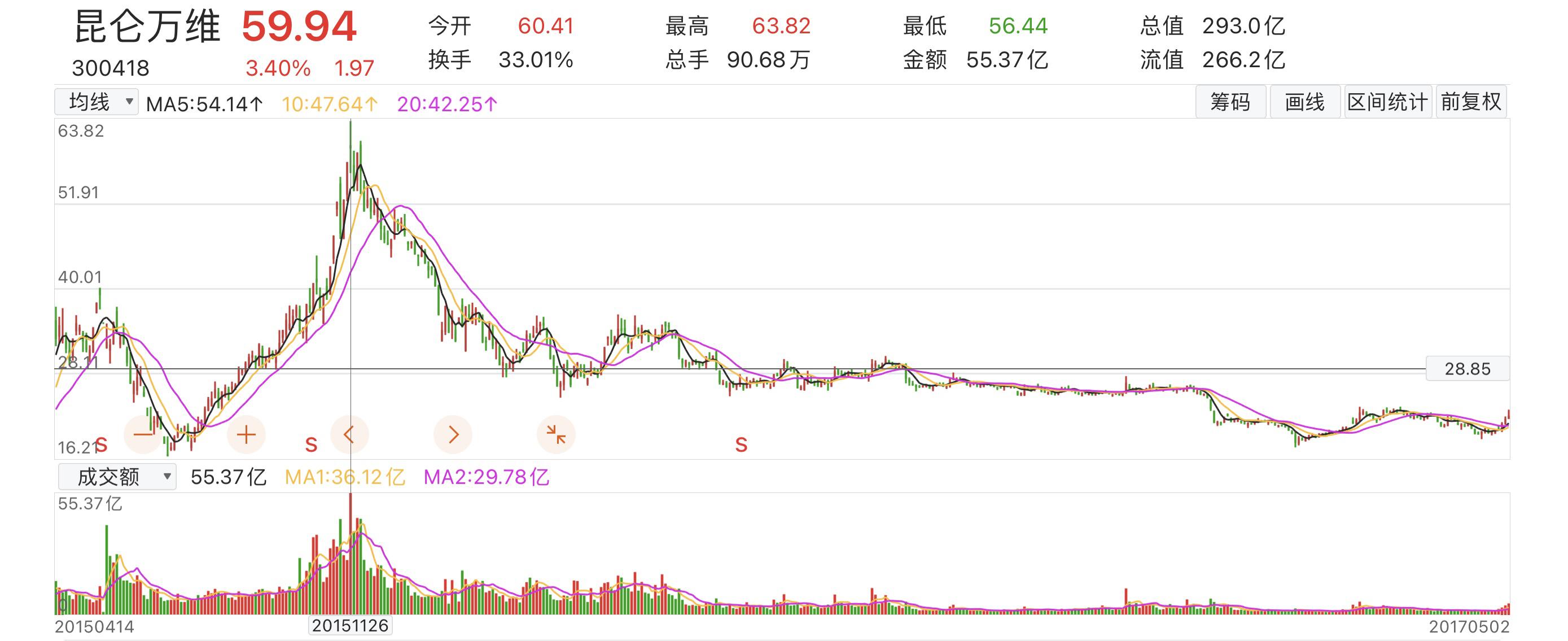 其实看一看昆仑万维股市走势也能看出来,自2015年上市创下62.62元/股(前复权)的股价巅峰后,即便是此后几年公司规模翻倍,也再也没有实现超越。