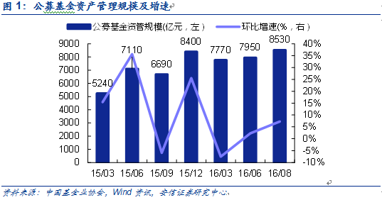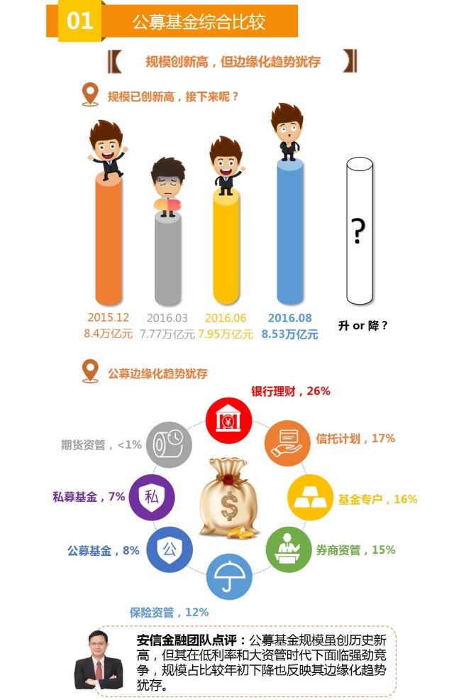 公募基金正在被边缘化吗?报告正文自1998年中国首只公募基金诞生以来,公募基金行业实现了快速发展,成为资产管理行业重要力量。经过2015年股市大跌后,公募基金回报率大幅下降,遭遇信任危机,产品发行持续遇冷。同时低利率大资管时代下竞争替代品较多,公募基金特别是权益类产品有边缘化风险。此外随着私募的发展,传统公募基金的激励机制不足日益凸显,众多基金经理离职给行业发展带来不利影响。1. 公募基金综合比较1.1. 行业概况:规模创新高,但边缘化趋势犹存根据中国基金业协会最新的数据,今年8月末公募基金资产管理规模达到8.53万亿元的历史新高,突破前期规模瓶颈,其中债券基金和混合基金成为新增规模的主力。