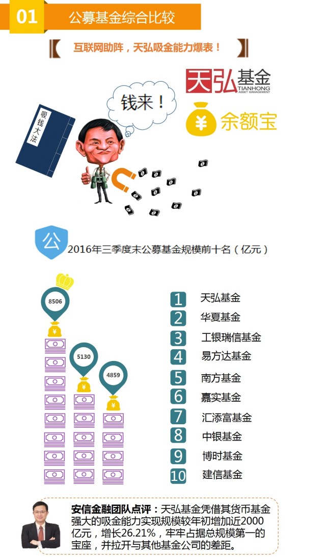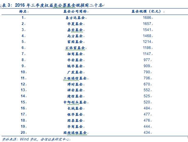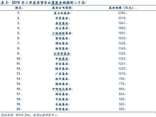 1.2. 规模比较:总体格局保持稳定2016年三季度基金公司排名与2016年二季度基本一致,只是中银、博时和建信排名互换,前十名名单并无变化。天弘基金凭借货币基金的吸金能力实现规模较年初增加近2000亿元,增长26.21%,牢牢占据总规模第一的宝座,并拉开与其他基金公司的差距。
