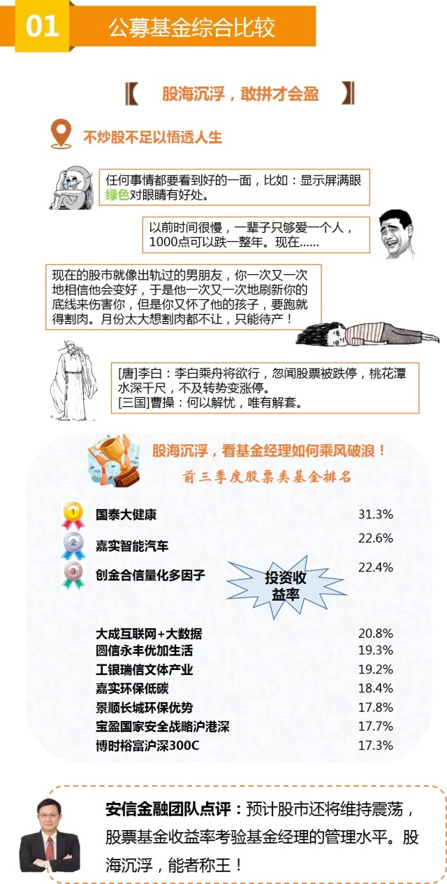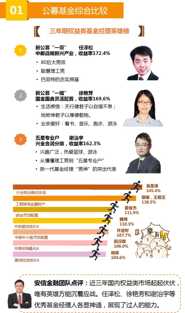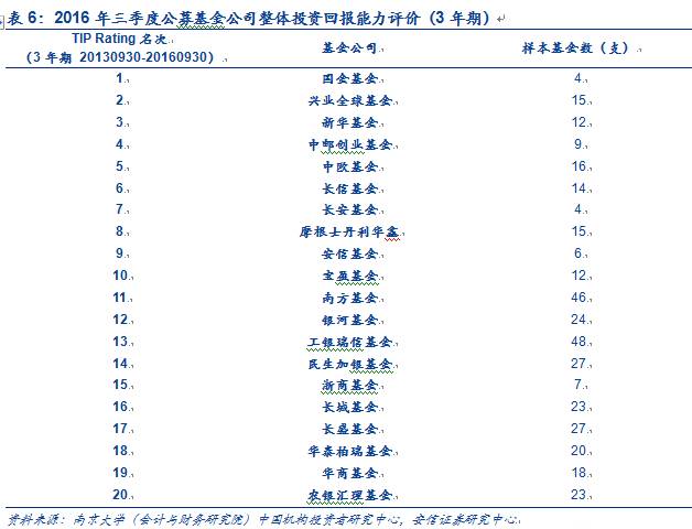 1.3. 业绩表现:混合型回报领先,中小基金表现不俗根据“南京大学(会计与财务研究院)中国机构投资者研究中心”开发推出的中国基金管理公司整体投资回报能力评价体系(TIP Rating) ,国金、兴业全球和新华三家基金公司近三年整体投资回报能力分列冠、亚、季军。总体来看,整体投资回报能力排名前列的基金公司多为中小型的基金公司,所管理的超过三年期基金数量仅在十支上下。
