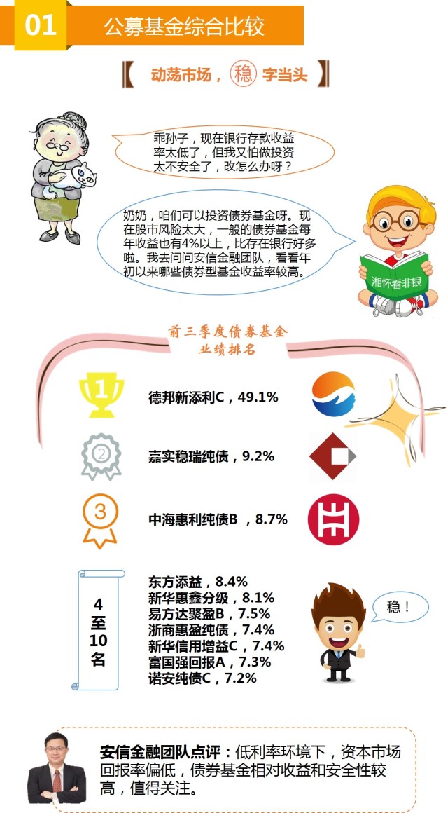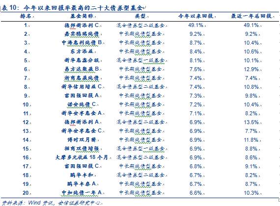 今年以来前十大债券型基金回报在7.2%以上,虽然新债换入摊薄收益水平,但总体仍能维持稳健的较高收益。债券型基金亏损面不大,且亏损基金多为可转债类基金,保守型的中长期纯债类基金和混合债券型(一级、二级)基金则表现较为突出。低利率环境下,资本市场回报率偏低,债券基金相对收益和安全性较高,值得关注。