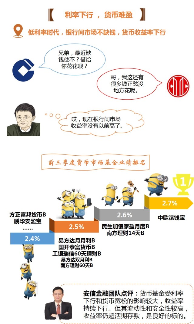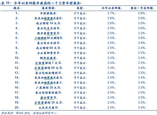 货币基金受利率下行和货币宽松的影响较大,收益率持续下行。目前货币基金收益率低于一年期定存利率(3%左右),但仍高于活期存款(0.35%左右)且具备支付功能,对于小额闲钱理财仍有投资价值。对于资金量较大的投资者来说,货币基金已不具备足够的吸引力。