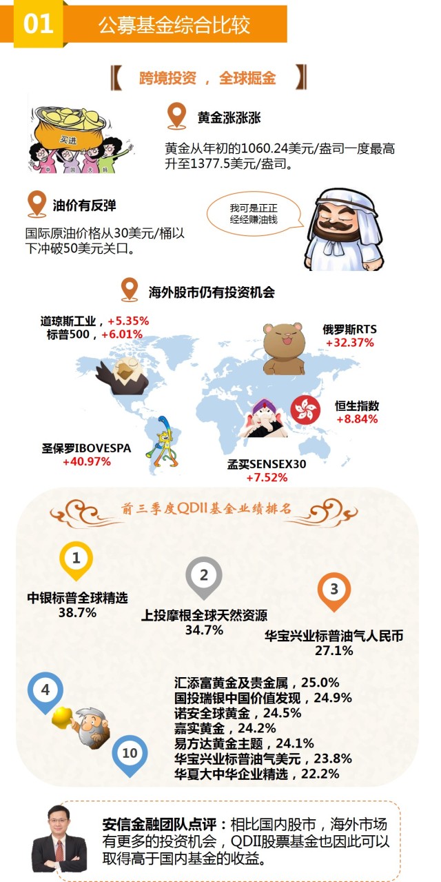 2016年上半年,黄金从年初的1060.24美元/盎司最高升至1377.5美元/盎司。受此影响,QDII另类投资基金中黄金类基金收益可观,四家黄金基金上榜。相对于国内股市,海外股票市场整体收益尚可,QDII股票基金也取得高于国内的收益。