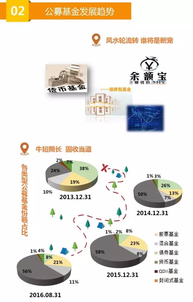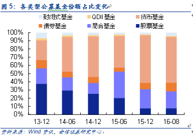 2. 公募基金发展趋势2.1. 产品结构:固收类产品占比持续上升公募基金产品销售策略较为灵活,会随着市场环境变化而推出当前最热门的投资组合。受货币基金高性价比和余额宝示范效应的影响,货币型基金份额于2014年初超过股票型成为第一;混合型基金具有投资范围广、操作灵活的特点,份额占比逐渐上升并于2015年6月跃居第二;由于股市转弱而债市转牛,股票型基金份额占比自去年6月起明显下降,而债券型基金份额占比则在去年年底升至第三。低利率背景下,偏债型基金更受投资者青睐,预计未来债券型基金份额占比还将继续提升。