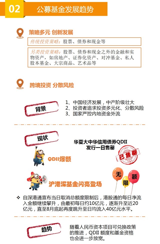 国家严控内地资金外流以及QDII爆额的背景下,剔除了总额度上限的港股通成为罕有而正规的外向投资渠道,以分散人民币贬值的风险。自深港通宣布当日取消总额度限制后,港股通的每日净流入金额继续攀升,由最初每日约10亿元,逐渐升至近20亿元,直至8月底起再度跳升至日均流入40亿元水平,A股前两周的日均股基交易额约5000亿元,港股通单日流入资金占约其1%左右,而去年这一比例仅为0.4%。另一方面,中国日益壮大的中产阶级进行全球市场配置的需求明显增加。目前中国银行业资产约为30万亿美元,流向股票和债券15万亿美元,成熟市场民众资产更多投向成熟的资本市场,香港市场的吸引力进一步提升。另外,随着人民币资本项目可兑换政策的推进,QDII 额度和基金资格也会进一步放宽。未来引进来与走出去相结合,家有猛虎,亦须全球逐利,中国的公募基金必然会在全球化的竞争中加速成长,向世界一流基金管理公司对标。预计量化投资、公募对冲等主题基金,也将在中国生根发芽。