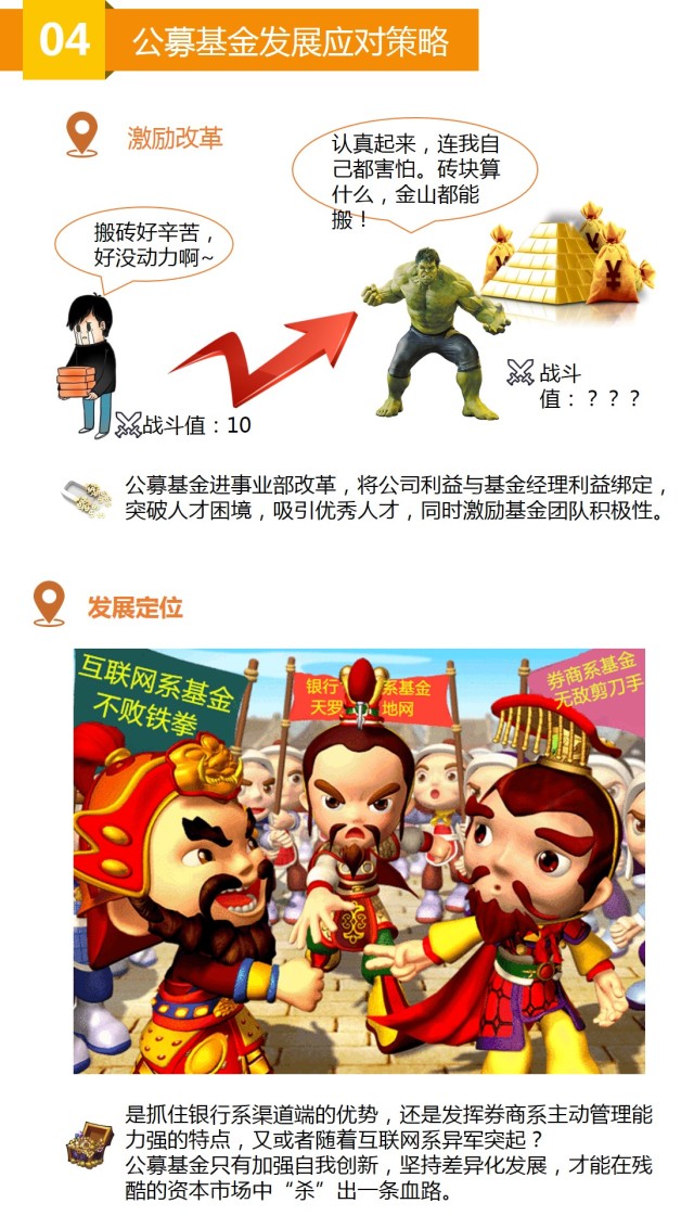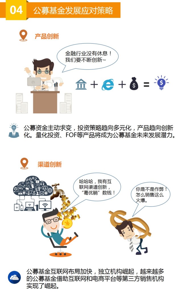 4.4. 发展定位:找准自身定位,差异化发展综合实力强劲的基金公司将向“全能型资管”发展。综合实力强劲的基金公司充分发挥自己的规模、名气、投研实力和渠道优势,通过外部兼并收购、内部为客户提供覆盖全面的产品和一站式服务,在业内实现规模领先、覆盖全面、配置均衡,打造“全能型资管”。这一模式的优点是资金来源和收益相对稳定,能较为从容地应对市场的变化;但规模和业务的扩张需要高额的资本投入,内部协调成本不可避免地上升。