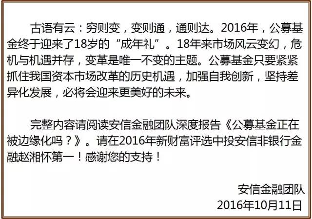 古语有云:穷则变,变则通,通则达。2016年,公募基金终于迎来了18岁的“成年礼”。18年来市场风云变幻,危机与机遇并存,变革是唯一不变的主题。公募基金只要紧紧抓住我国资本市场改革的历史机遇,加强自我创新,坚持差异化发展,必将会迎来更美好的未来。