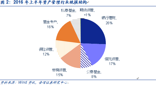 截至2016年6月底,公募基金资产管理规模达到7.95万亿元,占总资产管理规模的比重达到7.75%,较年初下降1.67个百分点,规模排名第六。公募基金在低利率和大资管时代下面临强劲竞争,规模占比下降也反映其边缘化趋势犹存。