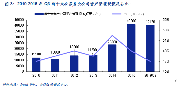 截至今年三季度末,前十大基金公司资产管理规模下降至4.02万亿元,规模占比(CR10 )降至47.1%。2010年至今我国基金业CR10一直在50%左右,且自2014年后明显下降,表明我国公募基金业竞争比较激烈。由于公募基金申赎容易,基金之间同质化、业绩受市场变化的影响大,因此投资者容易“用脚投票”。特别是近些年金融创新层出不穷,中小基金公司有可能异军突起,实现快速赶超。