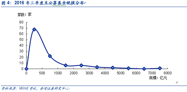 以全市场所有公司规模分布来看,67家公司规模不足426亿元,426-851亿元的公司有16家,851亿元以上的公司18家,规模分布呈现出明显正偏态分布,中小规模基金是市场多数群体。