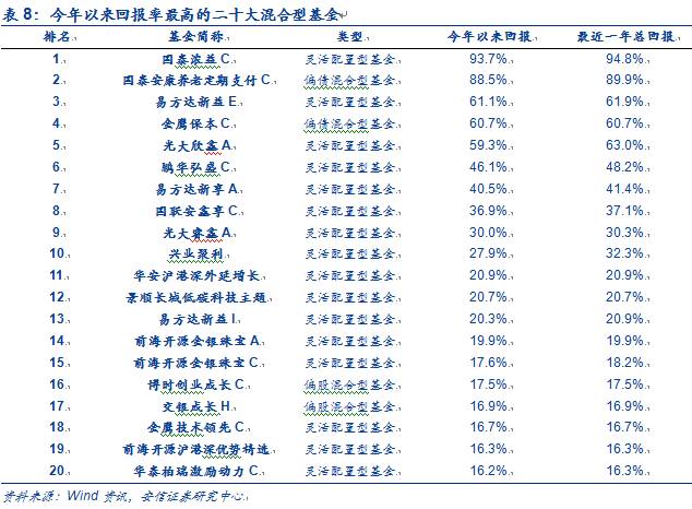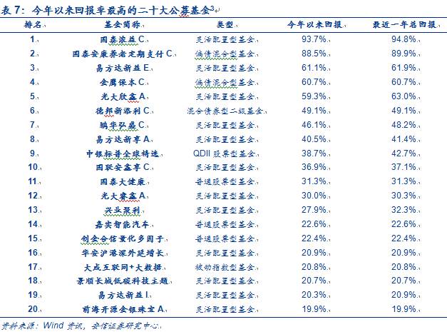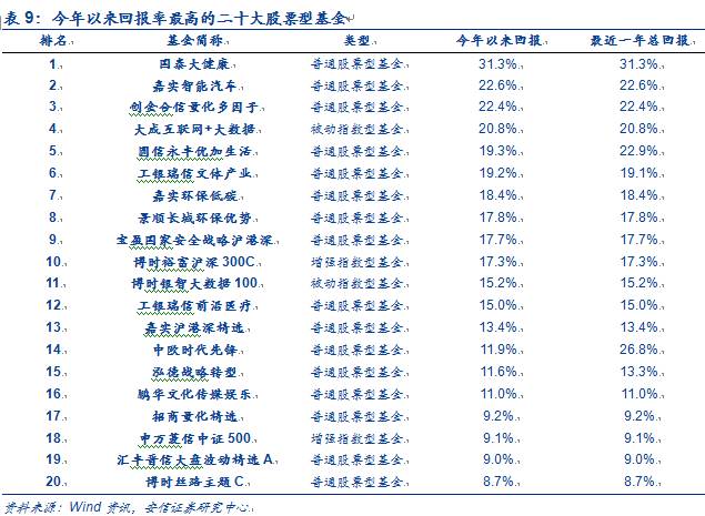 今年黄金和债券市场总体走牛,股市经历大跌后在2800点到3100点间箱体震荡,货币市场收益跌至3%以下。但今年国内债券市场、房地产、期货市场和股市各自经历一到两波的短“牛市”,风格切换过于快速而频繁,结构固定的基金类型难以获得绝对收益,因此今年以来回报率最高的十大公募基金中有六家是混合型基金。
