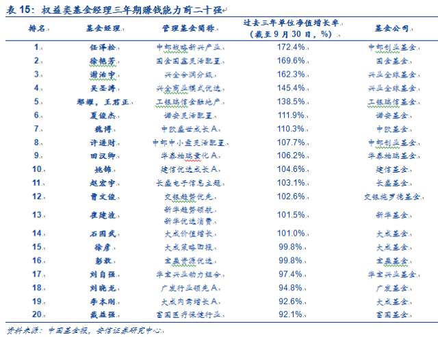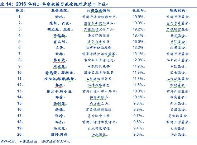 1.4. 基金经理:英雄辈出,各显神通前十的权益类基金经理均能获得超过10%的收益率,在股市低迷的背景下实属不易,展现了过人的投资管理能力。中小基金经理业绩表现亮眼,与前文展示的中小型基金公司整体投资回报能力较强相印证。其中,前十的基金经理中两家来自前海开源基金,体现了事业部改革的成效。