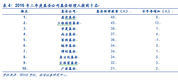 从基金经理数量来看,基本与规模水平一致。嘉实基金和工银瑞信基金今年净分别增加了8名和13名基金经理,充足的人才成为基金业绩的保障。