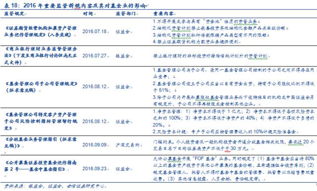 2.4. 监管趋严:力度趋严,机遇同存由于基金子公司专户对接银行理财的通道业务本质上是一类“影子银行”,虽然客观上满足了实体经济的融资需要,但也令监管层不能精确掌握市场中真实的货币存量,造成货币政策效果大打折扣。同时,银行和基金子公司在实践中存在违规使用资金池,实现期现错配套利,这也加大了资本市场风险。因此从去年下半年至今,银监会、证监会和保监会多项监管政策均针对通道业务,力求统一监管思路以消除监管套利,使资管业务“回归本质”,引导资金“脱虚向实”。