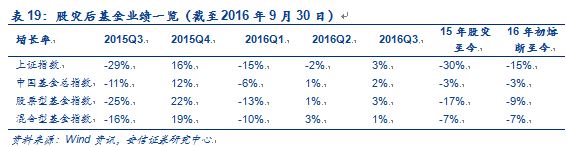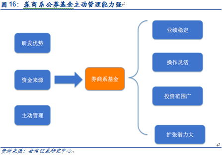 券商系公募基金主动管理能力强。券商系基金主要借助了券商的研发和投研能力,同时券商经纪业务也为基金带来资金来源。券商集合理财产品数量的不断增加也丰富了券商集合理财产品的种类和选择的余地。特别是在高端理财市场,券商在与公募基金、私募基金、信托、保险等对手竞争中,凭借专业化投资、差异化策略正在逐步体现特色,掌握业绩稳定、操作灵活、投资范围广、扩张潜力大等明显的后发优势。业内首只券商基金—东方红新动力混合基金成立于2014年1月,截至今年九月,累计单位净值为2.0680元,成立以来复权单位净值增长率110.77%。2014年6月6日成立的东方红产业升级混合基金,至2016年9月,累计单位净值为2.2120元,成立以来复权单位净值增长率121.20%。