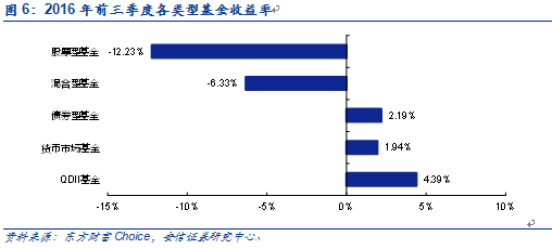 今年以来不同类型的基金收益率出现冰火两重天的格局。三季度QDII基金收益率达到10.96%,拉动前三季度收益率达到4.39%;债券型基金和货币基金均能维持稳定的正增长,但收益绝对值偏低。股票型基金和混合型基金三季度实现单季收益率为正,但全年来看仍亏损严重。