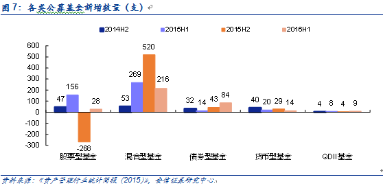 从新增的各类型基金数量来看,新发行基金会“追赶潮流”,同质化严重。例如2015年上半年股票市场最为火爆的时候,半年新增股票型基金156支,仅6月就增加了54支,同期债券型基金仅新增了14支。股市于去年6月起遭遇急跌,投资者选择从基金中赎回,导致大量股票型基金清盘,半年数量减少268家,同期配置更为灵活的混合基金增长520支。今年上半年,受资本市场风格切换频繁和债市走牛的影响,混合型基金和债券型基金新增数保持前二。