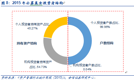 3.3. 管理成本:个人投资者和尾随佣金偏高2015年底,公募基金99.96%的客户是个人投资者,持有资产占比45.27%;机构客户虽仅有0.04%,但持有资产占比达54.73%。公募基金这一特性主要是因为各类型产品投资门槛普遍偏低(有些货币基金投资门槛甚至低至1分钱),一般个人投资者能够更容易地参与进来中,但相对应的则是缺乏对高净值客户的吸引力,人均资产管理规模也偏低。偏高的个人投资者投资比例也增加了基金赎回压力,相当于推高了基金的管理成本。