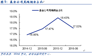 由于基金公司主要的收入来源于管理费,而管理费收入与管理规模挂钩而与投资收益无关(高收益仅是对投资者更有吸引力),因此基金公司在经营策略上更重视渠道和规模扩张。另一方面,不同基金公司在产品、收益和服务能力等方面均没有明显的差异。但随着经济下行和同质化的竞争,现行的经营方式已受到极大地挑战:盈利端,前文已述低利率下绝对收益难以实现;成本端,同业争夺渠道和机构客户非常激烈,基金公司尾随佣金占比逐年提升(今年上半年有所回落,但仍偏高)。