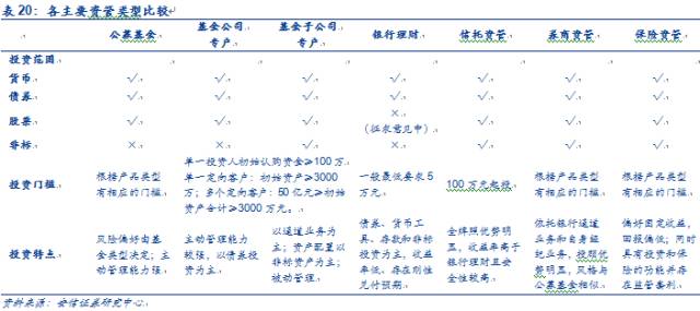 3.4. 外部竞争:低利率大资管时代各种替代产品加剧竞争低利率通常发生在经济增长缓慢且物价偏低的时期,根据经典的美林时钟理论,此时实物资产因为物价下调而失去投资价值,但债券投资可获得相对较高的票息收益,类债券的蓝筹股也可以获得较高的股息收益。由于低利率往往伴随着超额的货币供给,货币市场收益率将维持低位。股票市场的影响则不太确定,一方面市场避险情绪强、资金撤出利空股市;但另一方面低利率也有利于改善公司经营环境,股市体现价值投资属性。总体而言,低利率背景下资本市场难以寻找到高绝对收益的资产,固收类资产更具备防御价值,保险、债券基金等偏防御型的资管产品更受投资者青睐。随着我国大资管时代的到来,居民的理财渠道得到了极大的拓宽。除公募基金外,主要投资渠道还包括阳光私募、投资型保险、银行理财产品、私募股权、信托计划、券商集合理财等。由于监管规则差异,部分竞争产品相比公募基金具有天然竞争优势。各种替代产品抢占了部分公募基金的发展空间。