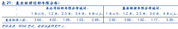 治理错位导致我国基金经理的任职年限分布呈现“年轻化”的格局,即基金经理在单一公司任职年限和个人任职年限均集中在2年以内,且多为内部培养。基金经理的业绩通常与其投资经验正相关,年轻的基金经理投资经验稍显不足且没有经过长时间的考验,难以获得投资者的充分信任。