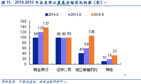 4.2. 渠道创新:互联网布局加快,独立机构崛起随着2013年-2015年货币市场和股市相继迎来牛市行情,公募基金销售火爆,销售渠道也愈发多元化,特别是借助互联网和电商平台等第三方销售机构的方式也越来越被基金公司所采用。根据证监会发布的2016年8月公募基金销售机构名录显示,公募基金销售机构已达375家,其中独立销售机构已从2014年的40家升至106家,已成为基金销售的重要力量。