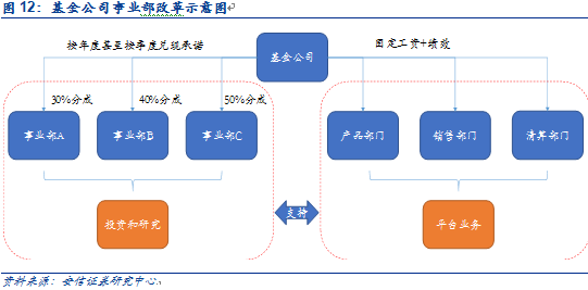 4.3. 激励改革:人才第一,激励放开 面对人才困境,部分次新基金公司大胆地对旧有的管理体制进行改革,特别是进行了事业部改革。所谓事业部改革,就是由优秀的基金经理担任投资事业部的合伙人,可以自主招聘投研人才,盈利与基金公司按约定分成,各事业部之间独立核算、自主管理、平行发展;基金公司则搭建产品、销售、研究等团队,负责产品设计、销售、清算、研究等中后台业务。许多基金公司还会给与基金经理股权激励,将公司利益与基金经理的利益绑定,更有利于留住和吸引人才。