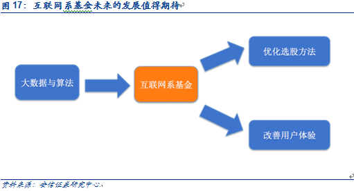 互联网系公募基金未来的发展值得期待。互联网指数基金依赖着大数据的支撑,在选股方法和发行渠道上都较传统指数基金进一步优化,有助于基金产品线的延伸和发行效率的提高。互联网基金的产品研发者致力于改善用户体验,无论是从产品的赎回时效、申购门槛、费用成本还是操作感受等方面,都以客户为中心进行改良。