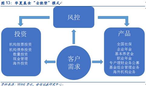 华夏基金采取的是典型的“全能型”模式。华夏基金围绕机构客户的多元化投资需求,构建了以投资、产品、风控为核心,全面覆盖机构股票投资、机构债券投资、数量投资、现金管理以及海外投资在内的专属投资管理和服务平台,其业务包括全国社保、企业年金、基本养老金、职业年金、专户理财业务、机构客户公募基金组合管理业务及海外机构业务等,基金产品覆盖各类不同风险收益特征品种。未来,华夏基金将继续完善其产品线,形成“以业绩较为稳定的固定收益类产品为塔基、高风险高收益产品为塔尖”的金字塔形结构。