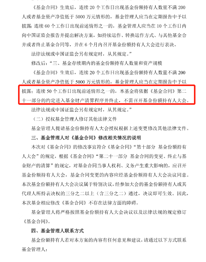 公告显示,此前的《基金合同》条款明确,当连续60个工作日出现基金份额持有人数量不满200人或者基金资产净值低于5000万元情形的,基金管理人应当在10个工作日内向证监会报告并提出解决方案,并在6个月内召开基金份额持有人大会进行表决。