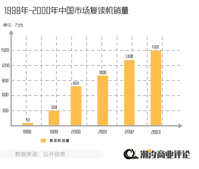 公开信息显示,1998年-2000年,中国市场复读机的销量分别为50万台、300万台和800万台;2001年复读机的销量超过1000万台,2002年达到1300万台,2003年已增加到1500万台。