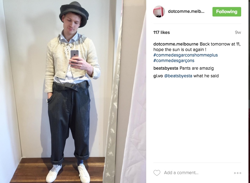 在之前我们和COMME des GARÇONS International、精品买手店Dover Street Market的总裁,以及川久保玲的丈夫Adrian Joffe的采访中,我和他提到了dot COMME的存在。出乎意料的是,这篇采访出稿后,在某品牌任职的PNIP在微信朋友圈留言给我,说dot COMME的创办人是自己在墨尔本生活时便结识的朋友。