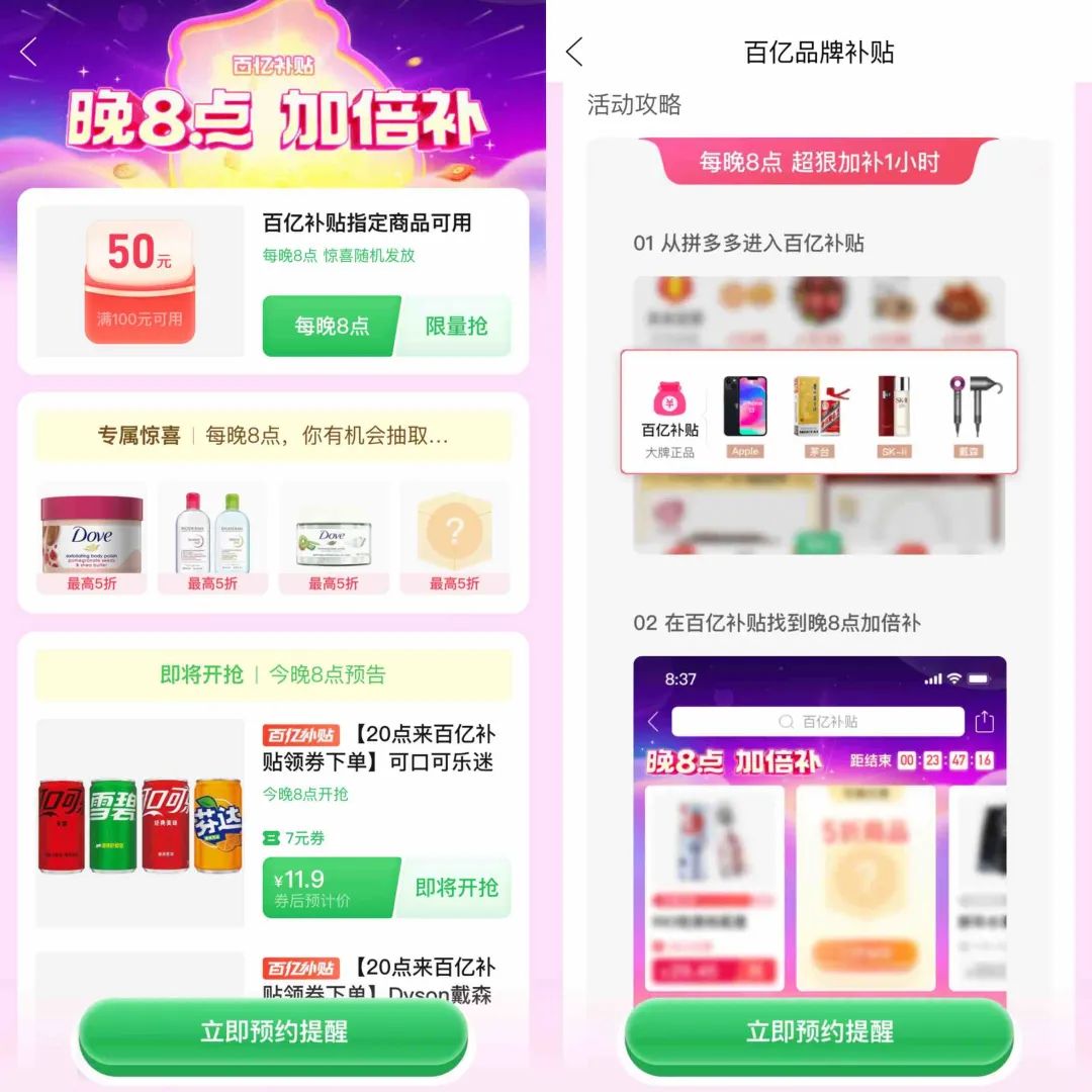 不过,“百亿补贴”并非新鲜事物,其他平台也同样在此处发力。对于拼多多而言,百亿补贴就已经是常态化玩法,为了在38大促期间更显优惠力度,拼多多还推出了“加倍补贴”,在百亿补贴之上再叠加上限量的满减券,以及针对一些指定商品进行限时领券抢购的活动。比如戴森的同一款吹风机,在拼多多“加倍补贴”限量抢购活动中的价格,要比聚划算百亿补贴和京东的百亿补贴再低一百多元,可以说是将优惠“卷”到了极致。