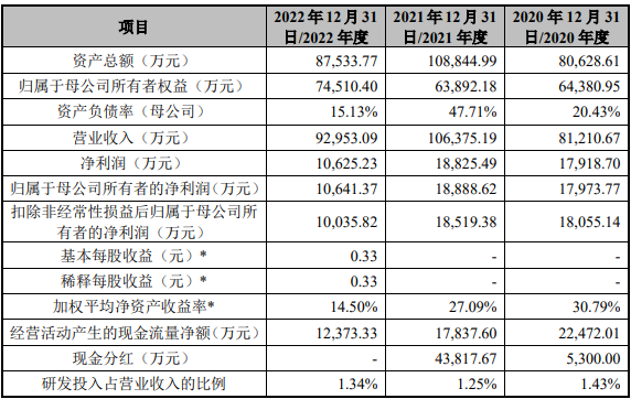 招股书显示,公司主要从事饮品类、口感颗粒类、果酱类和直饮类等产品的研发、生产和销售,属于新茶饮供应链的重要环节。2020年、2021年、2022年,公司营业收入分别为8.12亿元、10.64亿元和9.3亿元,同期实现归属于母公司所有者的净利润分别为1.8亿元、1.89亿元、1.06亿元。