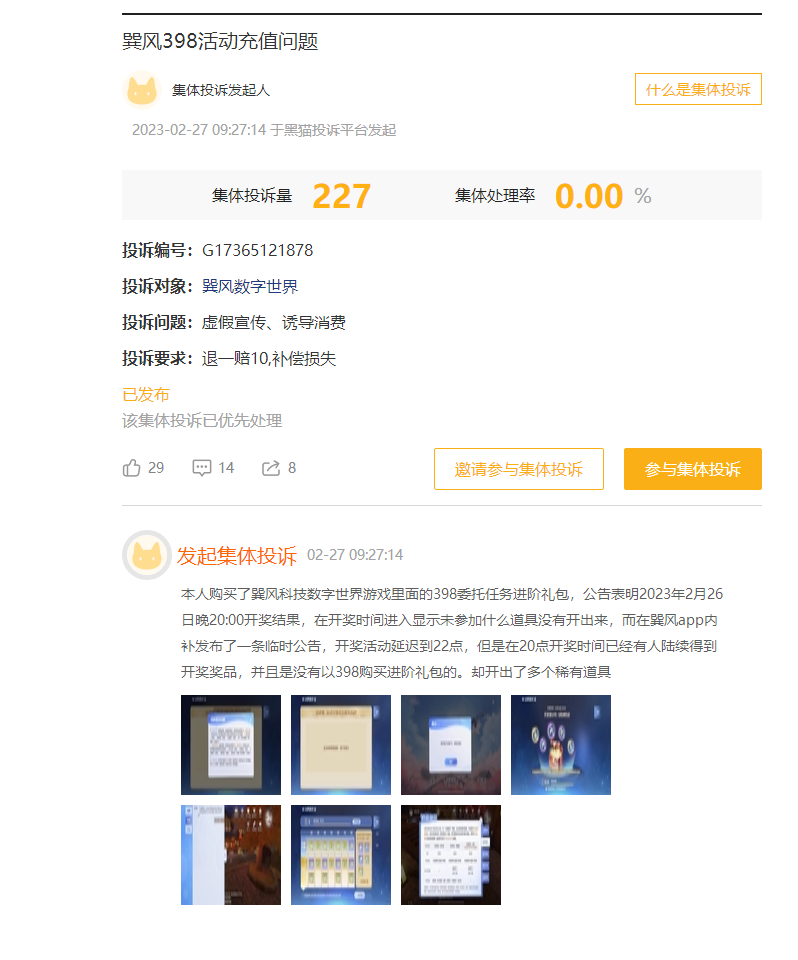 有意思的是,有玩家反馈称,一些未购买过398元礼包的用户,却在当晚八点开出了本没有资格开出的稀有奖品。因此他们质疑,巽风数字世界虚假宣传,诱导充值。