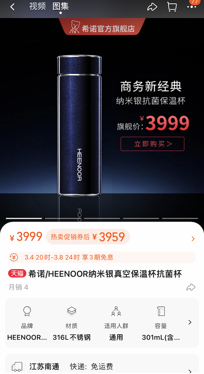 界面新闻记者从希诺旗舰店了解到的钛真空保温杯价格普遍在300元以上,而纳米银保温杯价格高达4000元。