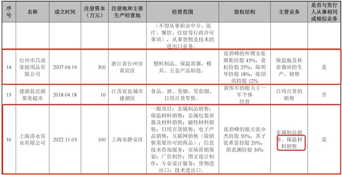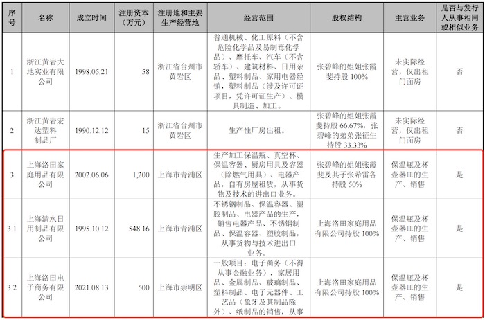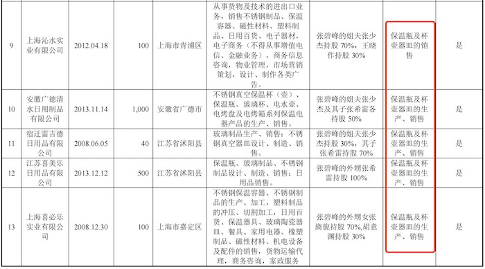 据统计,张霞斐及其配偶张少杰所控制的上海清水日用制品有限公司、上海洛田家庭用品有限公司、上海洛田电子商务有限公司、上海沁水实业有限公司、安徽广德清水日用制品有限公司、宿迁雷吉德日用品有限公司等6家公司,张霞斐之子女张希雷、张旖旎控制的江苏喜美乐日用品有限公司、上海喜必乐实业有限公司、台州市昌迪家庭用品有限公司等3家公司,以及2022年11月新成立的上海洛永实业有限公司(以下合称“上海清水及其关联方”)从事以“清水”品牌为主的热水瓶、玻璃杯、不锈钢真空保温杯等产品的生产与销售,存在与希诺股份从事相同或相近业务的情况。