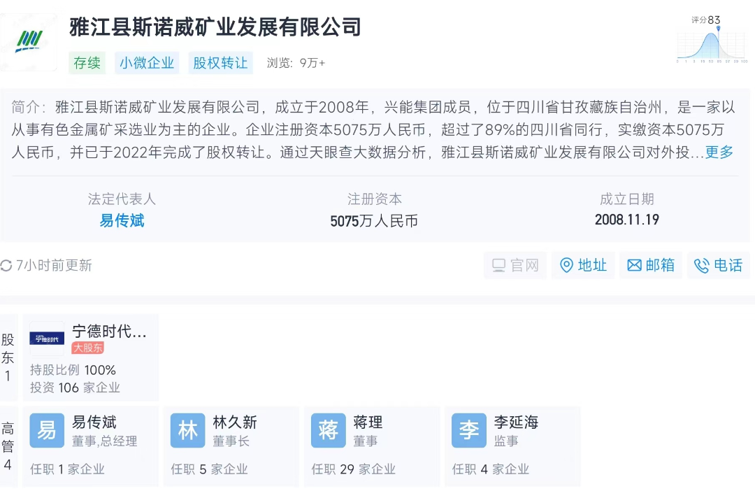 天眼查显示,3月6日,雅江县斯诺威矿业发展有限公司发生工商变更,原股东均退出,新增宁德时代(300750.SZ)为全资股东,同时公司法定代表人为及高管均发生变更。