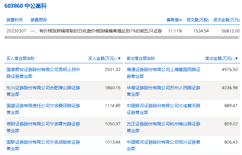 3月7日,中公高科今日涨停,龙虎榜数据显示,上榜营业部席位全天成交1.91亿元,占当日总成交金额比例为33.63%。其中,买入金额为7540.16万元,卖出金额为1.16亿元,合计净卖出4028.22万元。