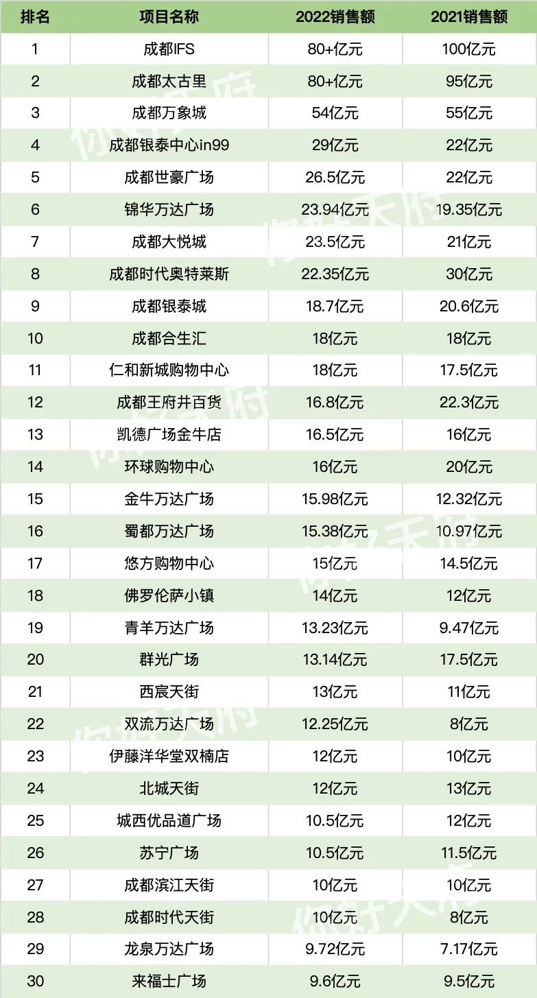 数据显示,排名前30的商业体中,销售额超过20亿元的有8家,销售额超过15亿元的有17家,这一数字比起2021年有所下降。