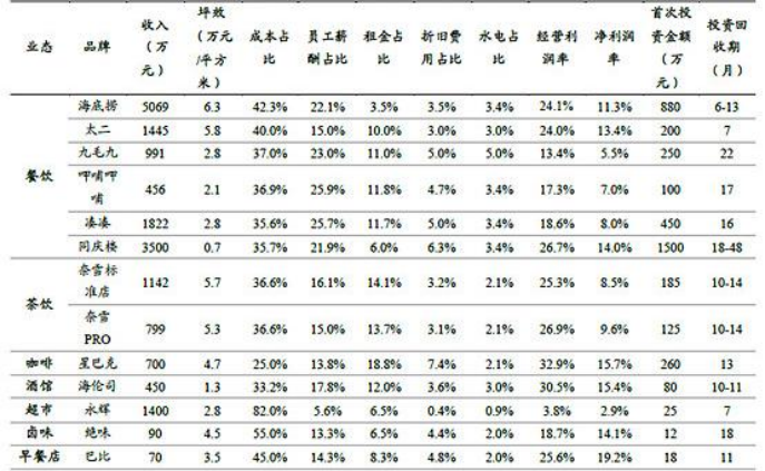 餐饮行业主要赛道投资回报情况对比;图源:国泰君安研报