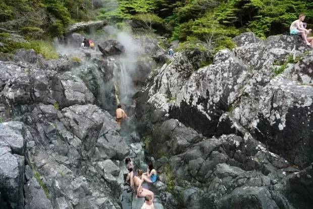 温泉湾在马奎纳(Maquinna)省立公园深处,约30分钟的林间漫步后,便可抵达。这里面朝太平洋,巨石围出七个天然地热温泉,要下到泉水中需要爬下陡峭的岩石,温泉从岩石间流下来,七个池子自上而下温度逐渐降低,温度最高的一座达到109度以上,最低的也有50度。人们一般从最高温的池子开始泡。到达最低一座温泉池时会发现这里的巨大岩石上悬挂着一条小瀑布,站在瀑布下泡温泉,不时有冰冷刺骨的太平洋海水涌入,冰火两重天,野趣十足。