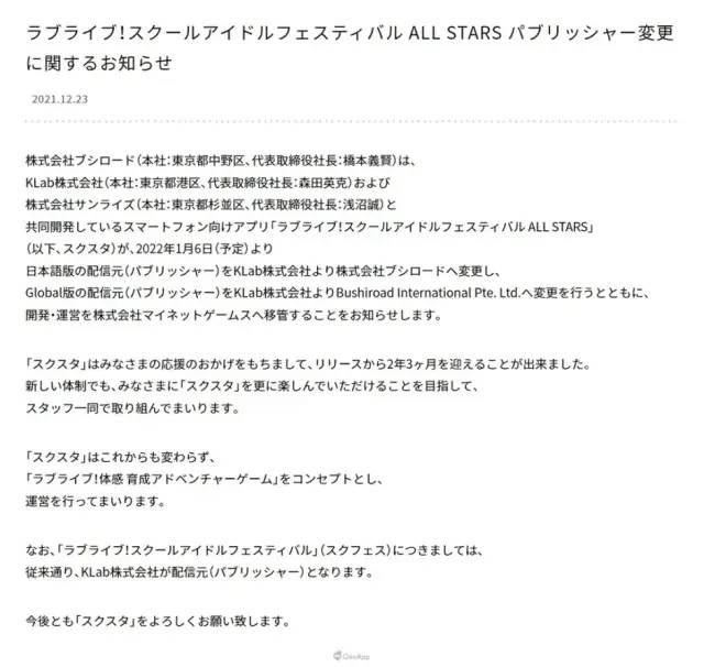 但如果一直观察“LoveLive”企划游戏的朋友就会发现,Klab已经逐渐在“LoveLive”企划中退场。2021年年底,Klab全面退出《Love Live! 学园偶像祭 All Stars》,发行全权转移到Bushiroad上,开发运营权也交给了Mynet。